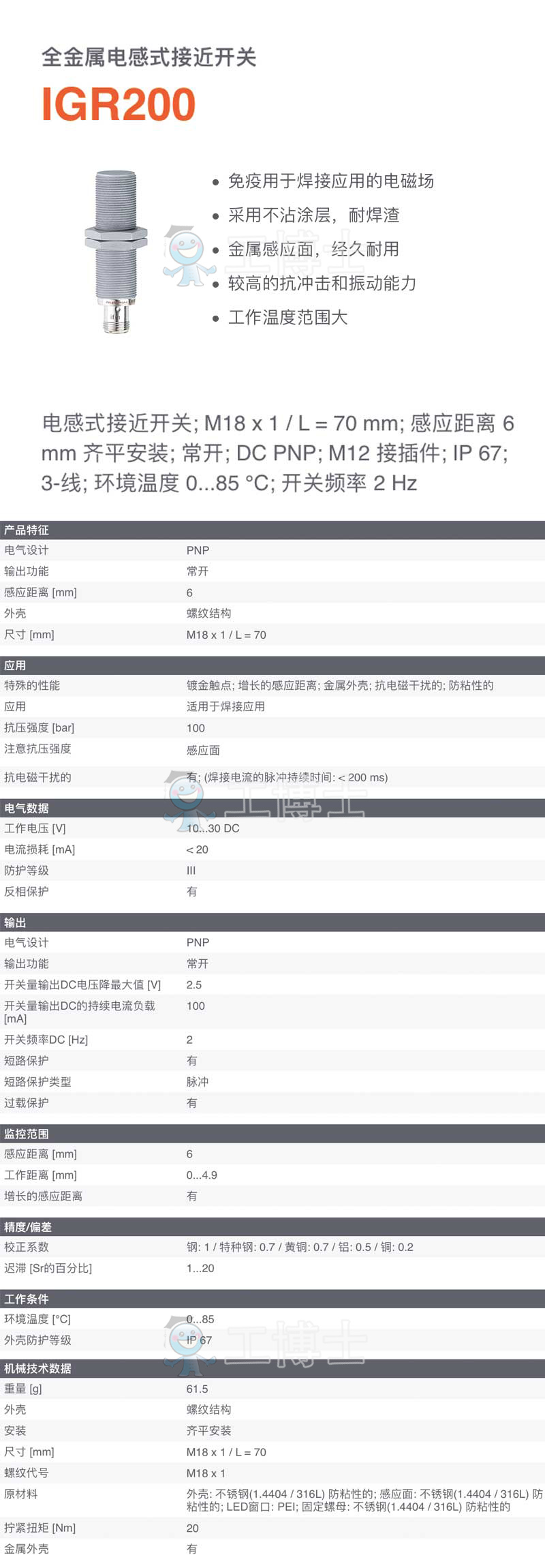 商城 ![]() ![]() 易福門IFM電感式接近開關(guān)IGR200品牌 :易福門 系列 :電感式接近開關(guān) 型號 :IGR200
