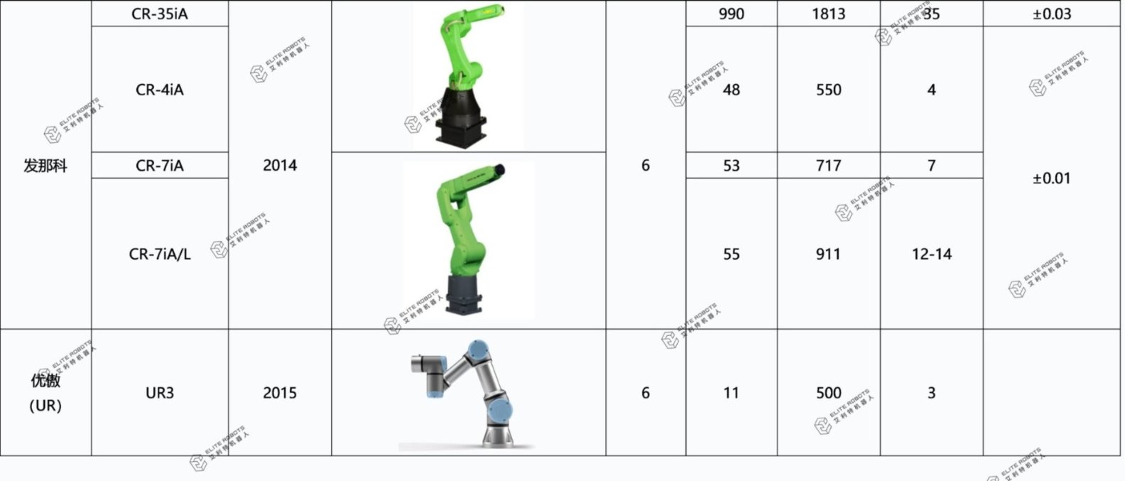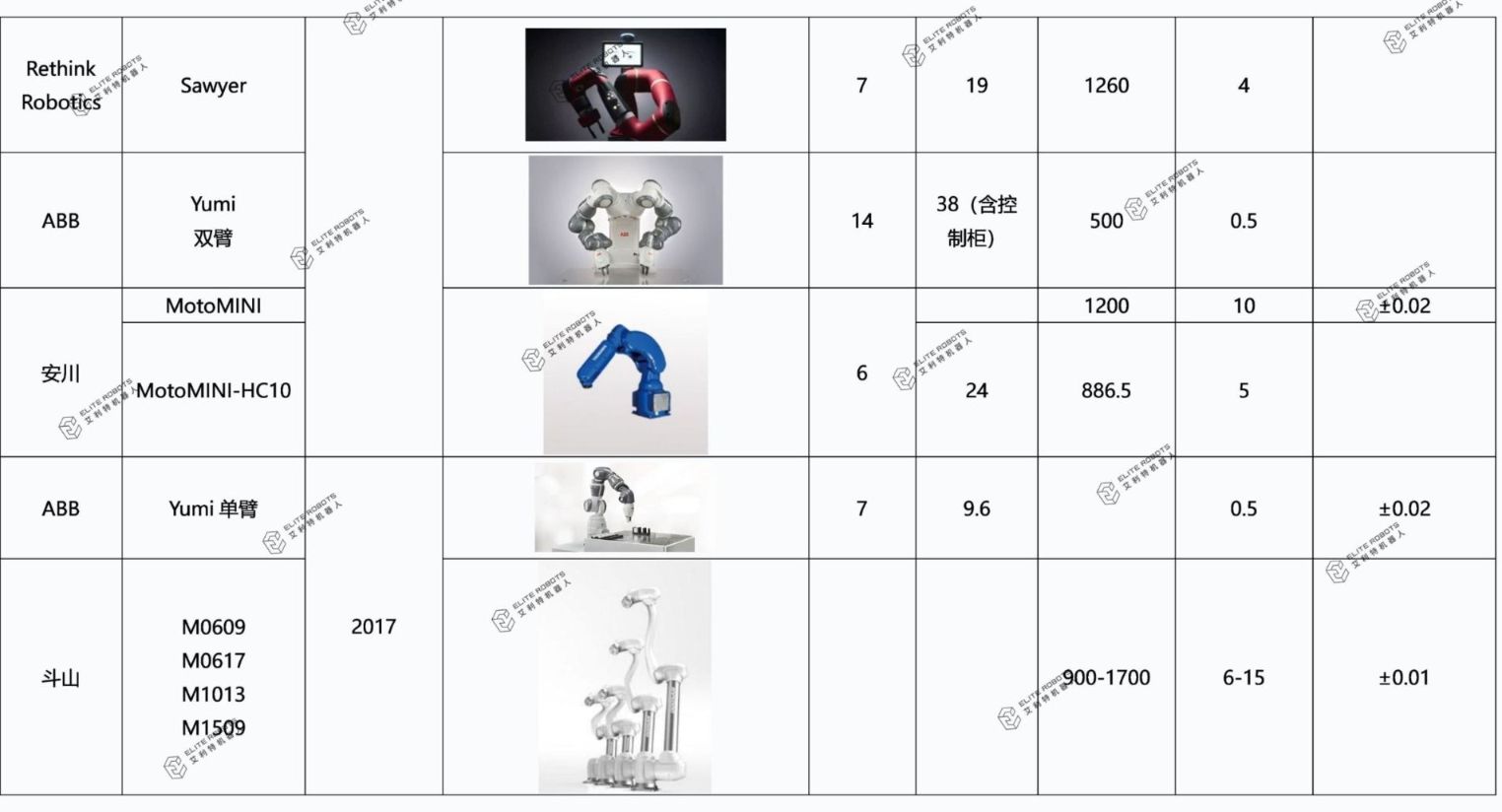 其實,從外形上來看,起初的協(xié)作機械臂更像是縮小版的工業(yè)機械臂,在縮小機械臂體積的同時其有效負載也同比下降,但相應(yīng)的,其對人體的傷害也同比下降,達到了協(xié)助工人安全作業(yè)、減小機器人占地面積和降低機器人制作成本以滿足中小企業(yè)需求的目的。從這一點上來說,低中負載協(xié)作臂的市場定位無疑是成功的。下面,我們將從各廠家首發(fā)協(xié)作機器人的產(chǎn)品型號來一探究竟……