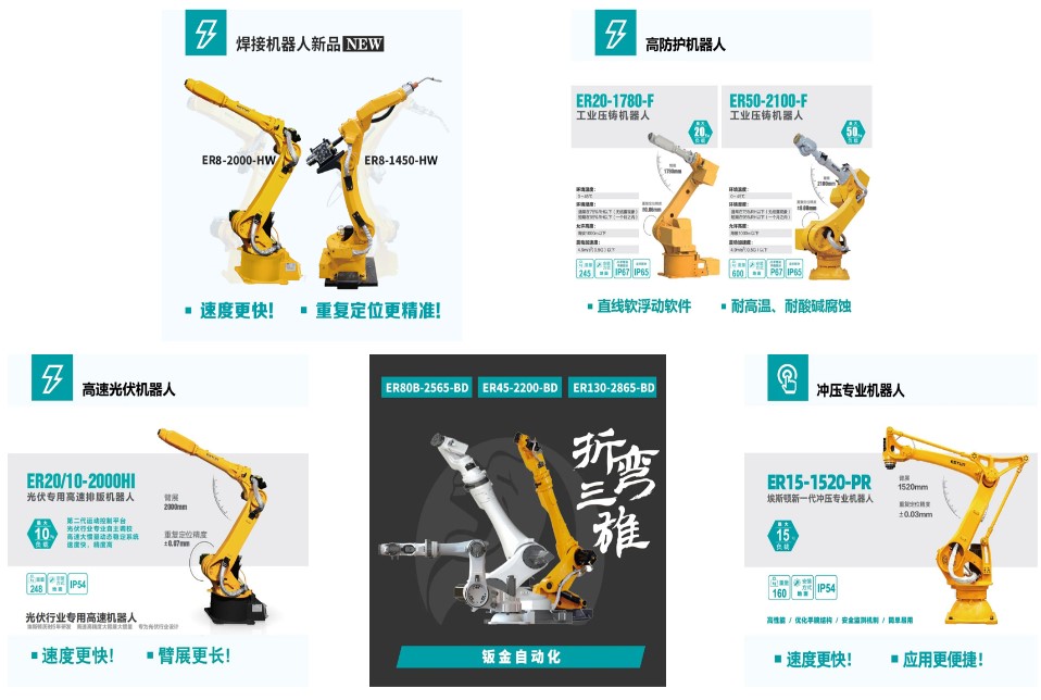 埃斯頓秉承通用+細(xì)分的行業(yè)發(fā)展戰(zhàn)略,在焊接,鈑金自動(dòng)化,沖壓自動(dòng)化,光伏行業(yè)自動(dòng)化,壓鑄自動(dòng)化等領(lǐng)域,深入調(diào)研用戶需求及行業(yè)工藝,基于強(qiáng)大的研發(fā)平臺(tái)和超高的效率,在多個(gè)行業(yè)推出定制化機(jī)型及完整解決方案。2021年,相繼在焊接,沖壓,壓鑄,鋰電池等行業(yè),全新發(fā)布6款機(jī)器人產(chǎn)品。