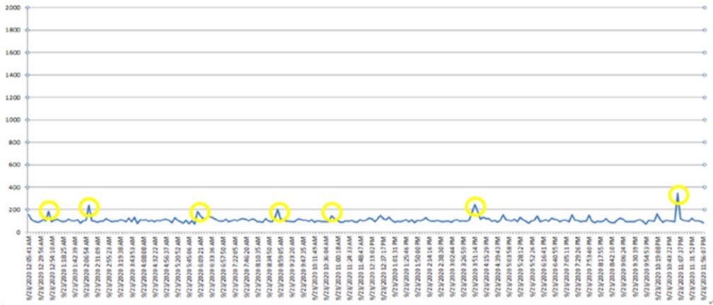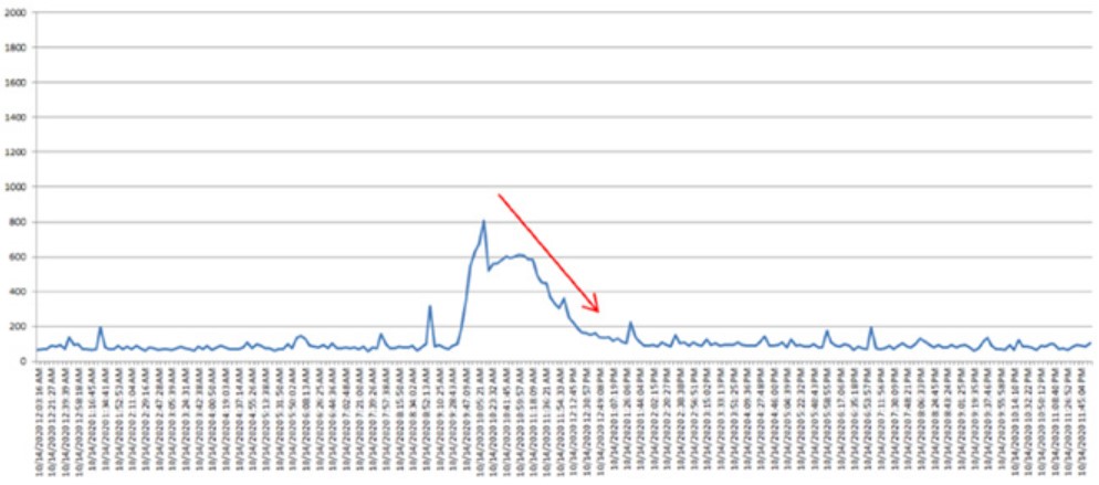 在回收水質(zhì)異常時(shí),儀器會(huì)實(shí)時(shí)呈現(xiàn)上升趨勢(shì),這時(shí)候客戶會(huì)對(duì)該水樣進(jìn)行處理,處理時(shí)水樣會(huì)劇烈波動(dòng),處理完畢后會(huì)回歸正常測(cè)值。如下圖紅色箭頭所示。