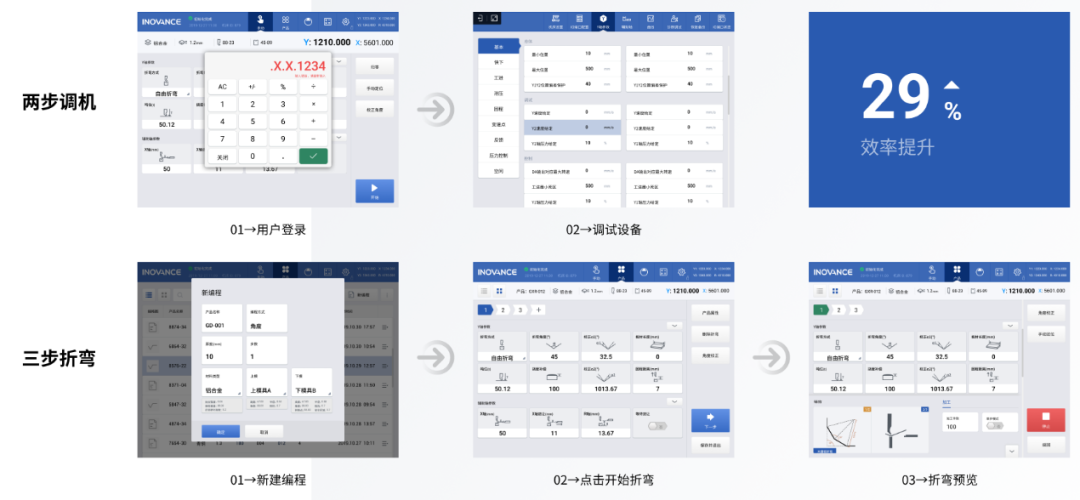 匯川技術(shù)“用戶體驗(yàn)設(shè)計(jì)中心”的體驗(yàn)設(shè)計(jì)團(tuán)隊(duì),與公司研發(fā)、測試工程人員緊密配合,結(jié)合應(yīng)用現(xiàn)場的深度訪談,掌握更全面的產(chǎn)品開發(fā)流程與開發(fā)邏輯,全流程了解用戶在各操作節(jié)點(diǎn)的體驗(yàn)痛點(diǎn),深度研究品 牌支持服務(wù)方對于機(jī)器安裝、調(diào)試中的交互流程,以及界面顯示規(guī)范的專業(yè)需求。打造“兩步調(diào)試、三步折彎”極 致效率的折彎機(jī)控制方案,同時(shí)以“千人千面”的交互設(shè)計(jì),引導(dǎo)用戶快速到達(dá)目標(biāo)界面,提升各環(huán)節(jié)不同角色對于設(shè)備界面操作的控制需求,提升整體使用體驗(yàn)。