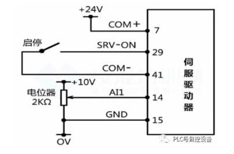 5、一個電位器(AI2)輸入轉(zhuǎn)矩值,一個電位器(AI1)輸入速度限制值模式接線圖如下: