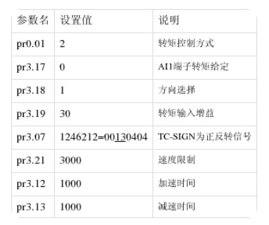 轉(zhuǎn)矩輸入增益是指1倍(100%)轉(zhuǎn)矩需要輸入的電壓10V。如電位器調(diào)到10V時,短時轉(zhuǎn)矩達(dá)到300%,則設(shè)定增益參數(shù)pr3.19=10/3≈3.3,再乘以10等于33。如100%轉(zhuǎn)矩時,電壓為3V,則增益設(shè)定為30。