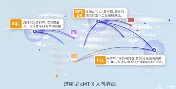 目前cMT X包含三種不同等級(jí)的機(jī)型,分別為基礎(chǔ)型、標(biāo)準(zhǔn)型和進(jìn)階型,適用于多元化應(yīng)用場景。進(jìn)階型cMT X人機(jī)界面是全方位智慧型HMI,擁有先進(jìn)的系統(tǒng)整合能力: