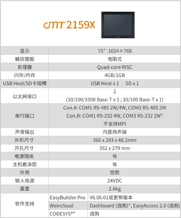 備注: cMT X系列標(biāo)準(zhǔn)型人機界面cMT2159X不支持部分特定功能,如CAN BUS, MPI, OPC UA服務(wù)器、數(shù)據(jù)庫服務(wù)器等。僅cMT X進(jìn)階型產(chǎn)品支持這些功能。詳情請參閱cMT X Series軟件功能差異表。
