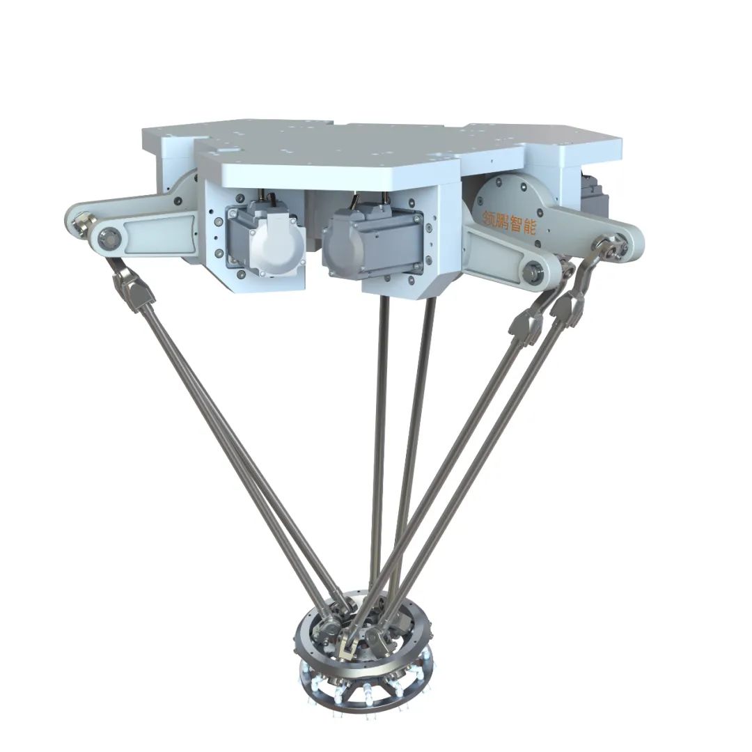 2、與傳統(tǒng)的4自由度并聯(lián)機器人相比,其工作末端可以實現(xiàn)更豐富的工作姿態(tài)和更靈活的運動動作,比如僅以簡單的夾具利用多姿態(tài)即可一批次抓取多個產(chǎn)品。