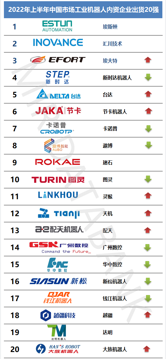 其中,發(fā)那科依舊保持第一領(lǐng)跑市場,有7家廠商排名出現(xiàn)下降,12家廠商排名有所上升,值得注意的是,埃斯頓排名第5,相比去年上升2位,還有節(jié)卡和珞石2021年未上榜,這次成為了新進(jìn)者,且節(jié)卡直接躍升至第16位,可見協(xié)作機(jī)器人出貨在加速。