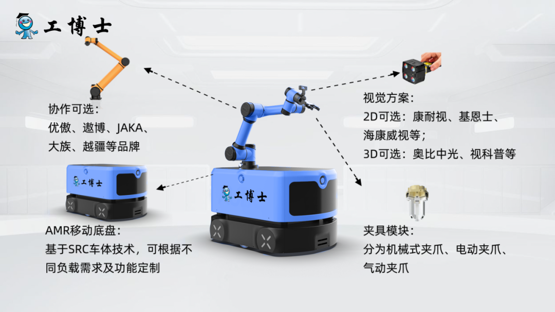 產品構成:產品由AMR移動底盤、協(xié)作機器人、視覺系統(tǒng)、夾具模塊等共同構成。